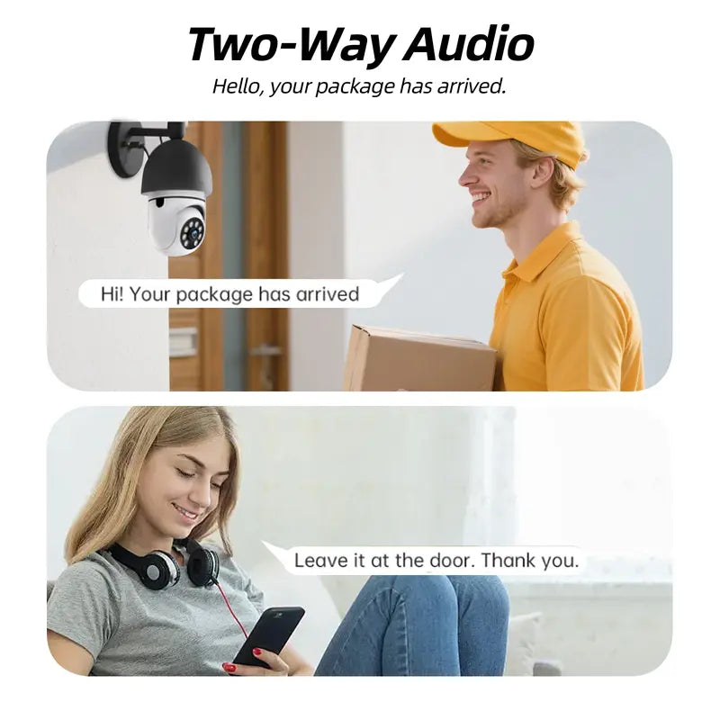 🎤 Talk and listen in real-time! Chat with family, pets, or visitors—or warn intruders with the built-in speaker & microphone.