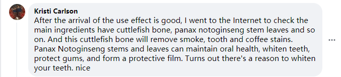 2、After the arrival of the use effect is good, I went to the Internet to check the main ingredients have natural organic bamboo charcoal,cuttlefish bone, panax notoginseng stem leaves and so on. And this cuttlefish bone will remove smoke, tooth and coffee stains. Panax Notoginseng stems and leaves can maintain oral health, whiten teeth, protect gums, and form a protective film.
