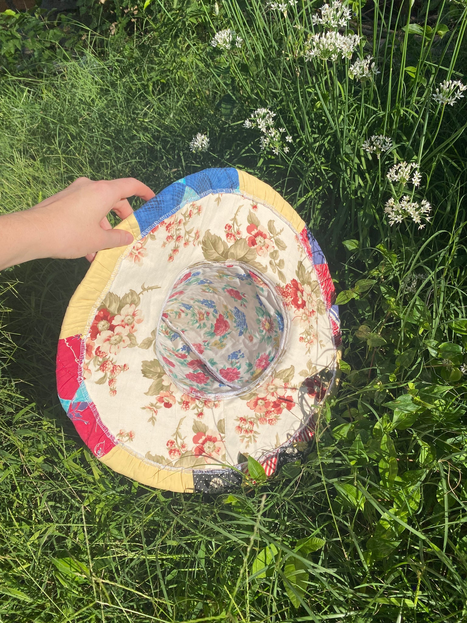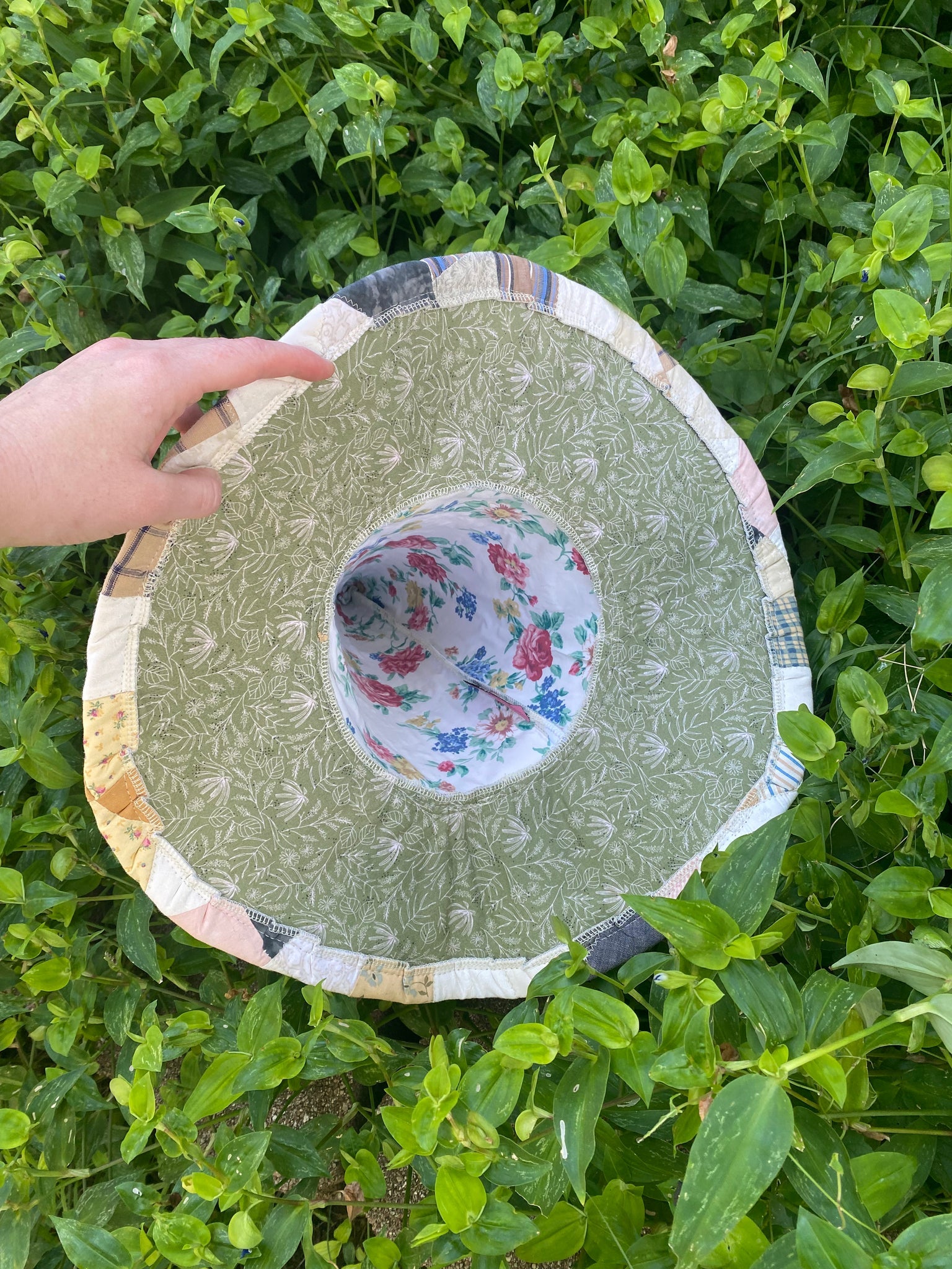 Each hat is meticulously crafted from a unique collection of patchwork fabrics, blending timeless craftsmanship with modern whimsy